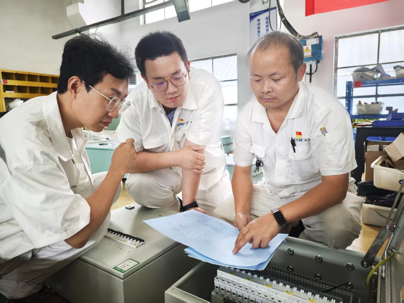 黨員帶頭,攻堅克難。電工組長何國虎,作為一線黨員、技能骨干,在完成某重點產品階段性試驗后,挺膺擔當,及時趕回部門支援電控箱生產,與組員吳天賦、李珉驍、袁菁菁、李江濤等一起趕進度、保節點。面對小組青年員工對新產品、新工藝裝配經驗欠缺的情況,何國虎充分發揮黨員先鋒模范作用,提前借出圖紙,利用工作間隙,帶頭示范正確裝配流程,傳授工作經驗。通過團隊共同努力,小組成員在一個月內完成了多個重難點項目,節點實現率100%。